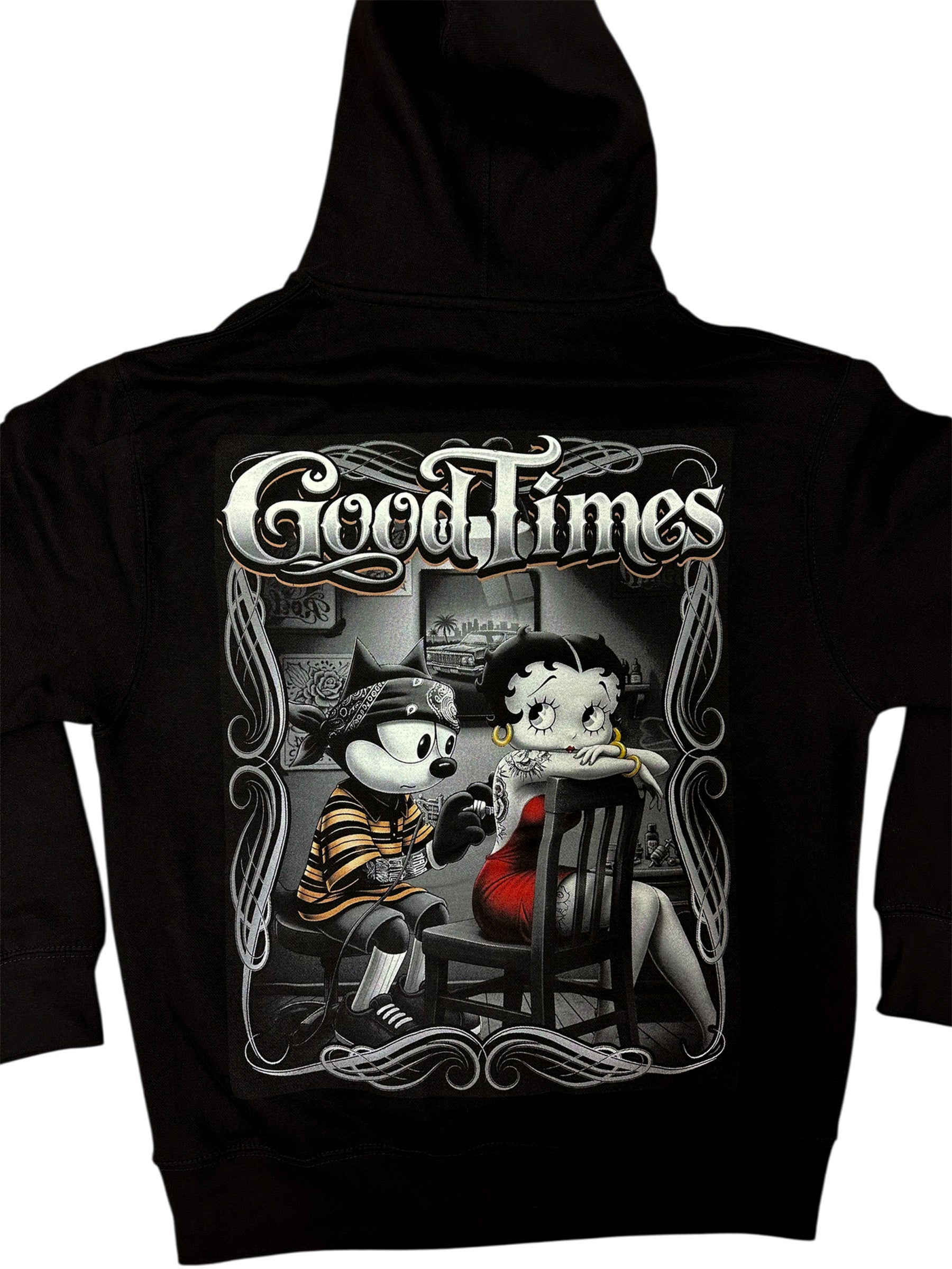 The Good Times Graphic Hoodie blends classic cartoon nostalgia with bold streetwear attitude. Featuring a detailed, vintage-inspired back graphic, this hoodie brings old-school vibes with modern urban style.